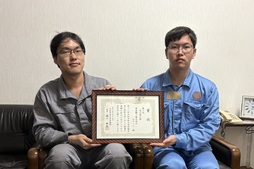 当社も防火意識と消火技術の向上を目的に毎年参加しています。今年は2チームが出場し、うち生産技術部チームが消火器部門第3位に入賞しました。