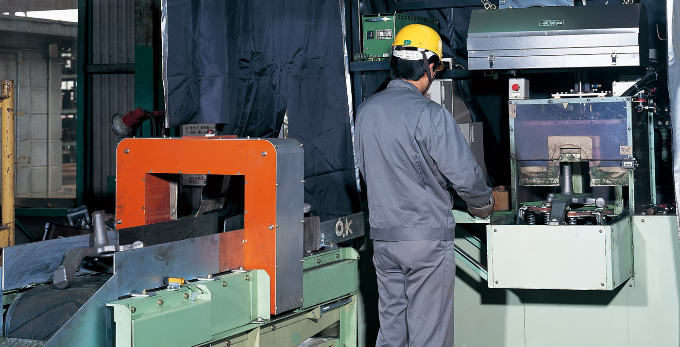 表面近傍の欠陥で、肉眼では容易に判定できないキズを検出するために、磁粉探傷装置を使用します。足回り部品や強度の保証が必要な保安部品が多い当社では、さらに蛍光磁粉の使用により、キズ検出能力の向上を図っております。