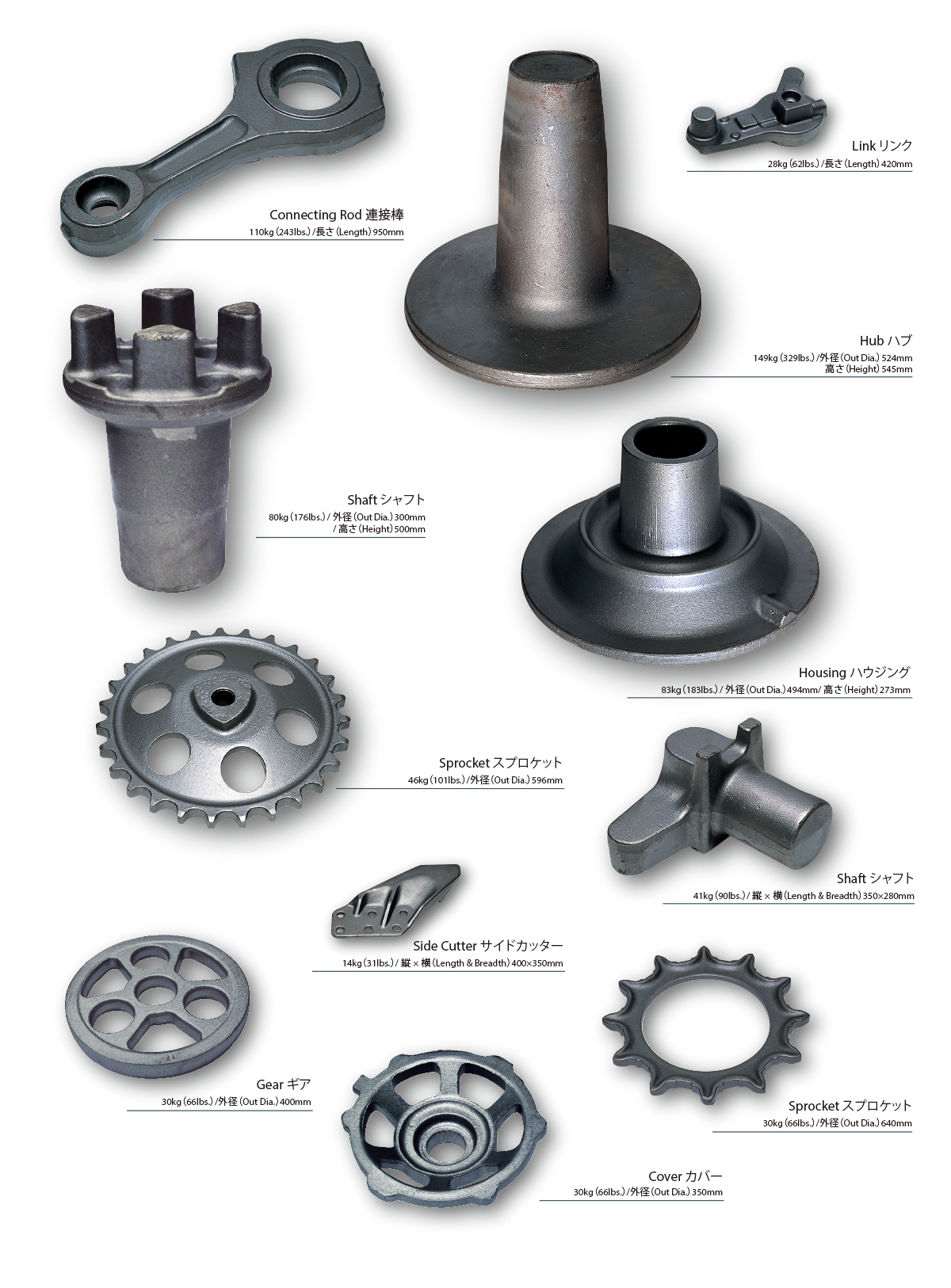 10トンエアードロップハンマーは日本では最大級の鍛造設備です。その圧倒的なパワーと熟練された技術者により、建設機械・鉄道車両・風力発電等最大200kgの製品を高精度かつ高能率で生産しています。