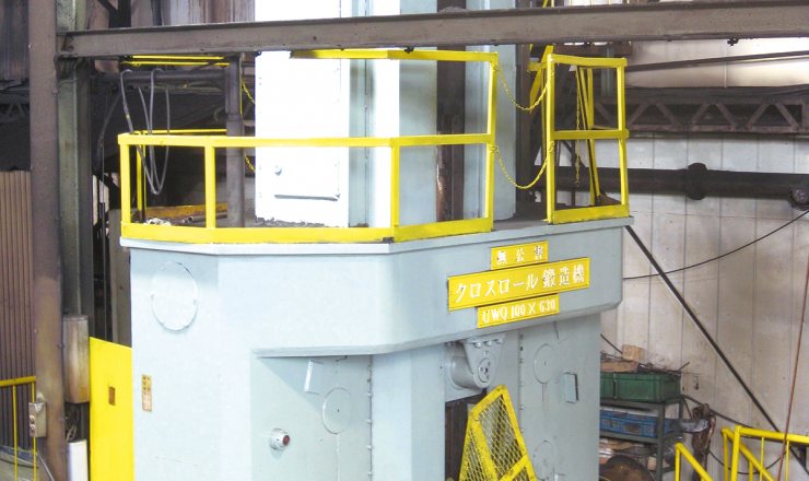 クロスロール鍛造機は、縦型の転造機としては国内でも非常に珍しく、併設のアプセットユニットとの半自動複合鍛造ラインにより、ミッション部品であるメインシャフト等を低公害・低コストで生産しています。