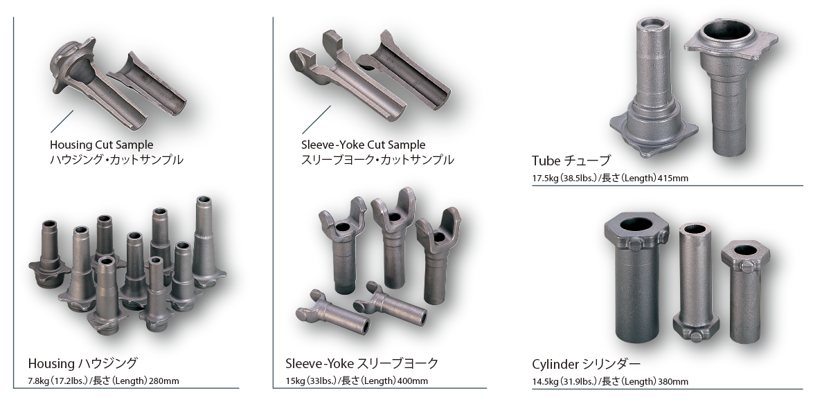 金型型打ちと複動油圧プレス鍛造の組み合わせにより、熱間鍛造では困難とされていた薄肉中空品、複雑形状及び重要安全部品、例えばアクスルハウジング、油圧シリンダーが製造可能となりました。